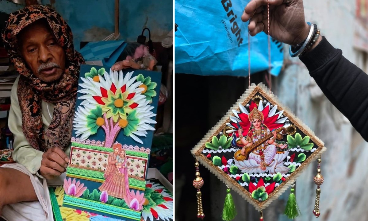 In a world that is quick to discard the old and chase the new, a quiet artist in Varanasi is doing the opposite. At 75, Raj Kumar ji spends his days giving forgotten things a second life i.e. wedding cards, broken bangles, scraps of paper and objects most people would throw away without a second thought.